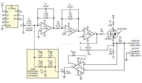 本例中的電池模擬器復(fù)制了電池的ESR響應(yīng)曲線。如果你在反饋網(wǎng)絡(luò)中安排不同值,那你就能獲得各種ESR曲線。該電路可模擬大部分電池類型,其中包括鋰離子電池和堿性電池。它為受測(cè)設(shè)備支持0.5V至4.2V的數(shù)安培電流,并能模擬多種電池的ESR.你可以設(shè)置ESR電位計(jì),來(lái)把延時(shí)改變?yōu)镋SR的最終值。某些電池類型表現(xiàn)出這一獨(dú)特的特征。對(duì)于向負(fù)載提供脈沖電流的工作,它具有很大的影響。