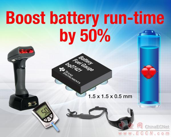 TI宣布推出業(yè)界最小、最高精度的鋰離子電池電量監(jiān)測計(jì)集成電路,該最新 bq27421 可延長便攜式醫(yī)療設(shè)備(如可穿戴健康監(jiān)控設(shè)備)、工業(yè)設(shè)備(如庫存掃描儀和便攜式應(yīng)急燈)以及其它消費(fèi)類電子產(chǎn)品的電池使用壽命。