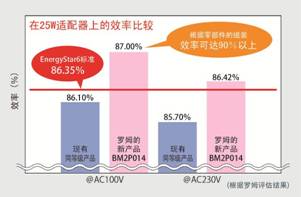 為了提高效率,采用了羅姆自產(chǎn)的高效超級結(jié)MOSFET;為了最大限度發(fā)揮出內(nèi)置MOSFET的性能,徹底優(yōu)化了驅(qū)動電路。效率符合Energy Star 6.0要求的86.35%,用于AC100V、25W的適配器時,與一般產(chǎn)品相比,僅僅替換IC本身就能實現(xiàn)87%以上的效率。通過進一步優(yōu)化外圍部件,效率還可改善到90%以上。