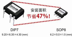 AC/DC一般多采用平面型MOSFET,因散熱問題而較難實現(xiàn)小型化。此次,羅姆采用了自產(chǎn)的超級結(jié)MOSFET。通過內(nèi)置多種保護功能減少了外置部件數(shù)量。8W級別以下的產(chǎn)品,除了標準的DIP7封裝,又新增了可表面貼裝的SOP-8封裝產(chǎn)品。采用SOP-8封裝(6.2mm×5.0mm×1.5mm)產(chǎn)品,安裝面積可節(jié)省47%,不僅能使配套產(chǎn)品更加小巧,而且設計和基板布局也更加簡單。