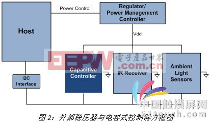 在這些應用中,主機控制器負責控制一個外部穩(wěn)壓器或電源管理集成電路(PMIC),通過外部穩(wěn)壓器或PMIC來控制和調(diào)整電容式控制器及其他設備的電源。下圖2給出了典型的實施方框圖!