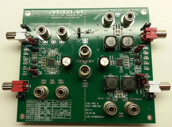 圖1. 整個項目從MAX98400A開始。評估板上有兩個40W放大器,我計劃設計的音箱聲音會很響亮。