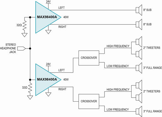圖2. 在手提音箱中采用兩個MAX98400A放大器的揚聲器元件原理圖。一個放大器專用于推動大8in揚聲器,另一個放大器通過交叉點開關推動兩個2in高音揚聲器和一個3in全頻揚聲器。