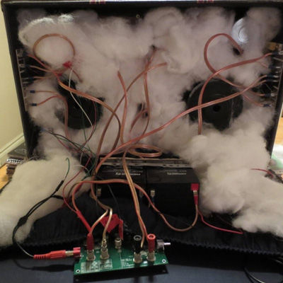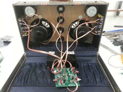 圖3. 我使用規(guī)格為12的音頻線(據(jù)我所知,這很穩(wěn)固)和香蕉插孔將揚聲器連接至電路板。然后將交叉點開關用膠水粘在手提音箱壁上。