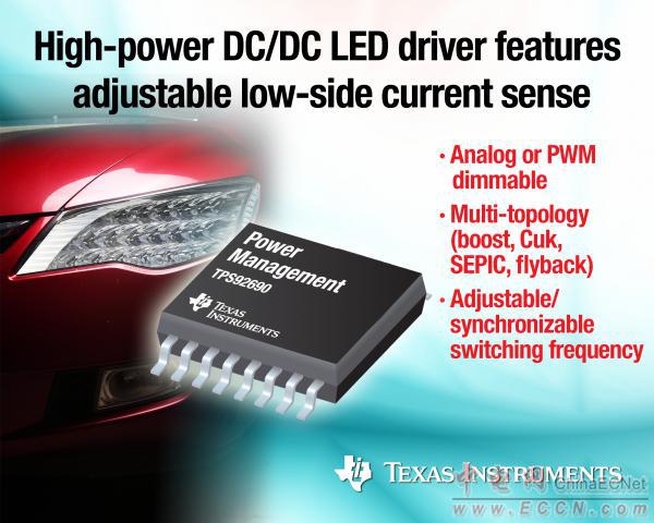 TI宣布推出一款支持可調(diào)節(jié)開關(guān)頻率與電流感應(yīng)閥值的大功率多拓撲 DC/DC LED 驅(qū)動器,其可為汽車前大燈、霧燈以及通用照明提供設(shè)計高靈活性與低電磁干擾 (EMI)。該 TPS92690 是一款配備低側(cè)電流感應(yīng)的 N 通道 MOSFET 控制器,支持升壓或升降壓(SEPIC、Cuk、反激)LED 驅(qū)動器拓撲。