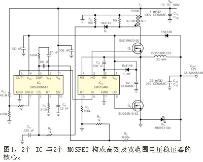 圖1所示電路采用美國國家半導體公司 (National Semiconductor) 的LM5020型電流模式PWM IC來驅(qū)動 LM5104 的柵極驅(qū)動器IC2, 以形成一個同步控制器。LM5020 包括一個可承受最高100V輸入電壓的內(nèi)部線性穩(wěn)壓器,并可提供為LM5104供應驅(qū)動電流的輸出。為降低高輸入電壓下的功耗,在起始功率加上后,1N4148 型二極管D2為電路其他部分提供一個11.5V的自舉電壓。由Pulse Engineering公司提供的100比1電流變壓器T1在MOSFET Q1導通期間提供電流反饋。Q1與 Q2均為具有低柵極電荷要求與低導通阻抗的 Siliconix Dpak 器件,用來減小電路在 200kHz 工作頻率上的總開關損耗。所有電容器均采用 陶瓷介質(zhì)結(jié)構(gòu)的,以承受高溫并滿足封裝尺寸的制約。
