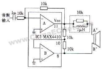 在BTL結構,IC1 MAX4410的右通道用作主放大器A,它設定器件增益,驅(qū)動揚聲器的一端A,,并給左通道B提供信號,左通道B配置成單位增益的跟隨器B,對右通道的輸出進行反相后驅(qū)動揚聲器的另外一端B,。為保持低失真和良好的匹配,需用精密電阻設定左通道的增益。