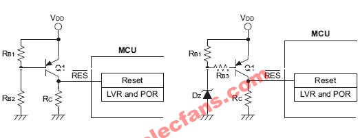 當(dāng)使用穩(wěn)壓二極管時(shí),其低電壓復(fù)位點(diǎn)約為VZ+0.5V,RB1 用于設(shè)定工作點(diǎn)VZ,RC 電阻值最好大于100kΩ,RB3 的電阻值約為10kΩ。