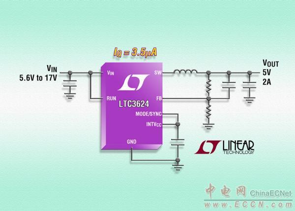 照片說明:17V、2A 同步降壓型穩(wěn)壓器僅需 3.5µA 靜態(tài)電流 |