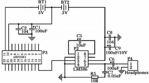 接收端的電路圖如4圖所示。nRF24E1芯片提供一個(gè)PWM輸出口。nRF24E1的PWM輸出信號(hào),通過(guò)一級(jí)放大,就可以得到所需的音頻模擬信號(hào)。