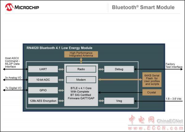 Microchip推出公司首款藍(lán)牙® 4.1低功耗模塊。RN4020基于Microchip在傳統(tǒng)藍(lán)牙技術(shù)方面積累的深厚經(jīng)驗(yàn)研發(fā)而成,新模塊通過了全球法規(guī)認(rèn)證以及藍(lán)牙技術(shù)聯(lián)盟(SIG)的認(rèn)證。集成的藍(lán)牙低功耗(BTLE)協(xié)議棧以及對(duì)通用SIG低功耗配置文件的板載支持既加速了產(chǎn)品的上市時(shí)間,也確保了藍(lán)牙技術(shù)的兼容性,在免除高昂認(rèn)證費(fèi)用的同時(shí)還降低了開發(fā)風(fēng)險(xiǎn)。此外,該模塊預(yù)裝了Microchip低功耗數(shù)據(jù)配置文件(MLDP),使設(shè)計(jì)人員可以輕松通過BTLE鏈接傳送任意類型的數(shù)據(jù)流。