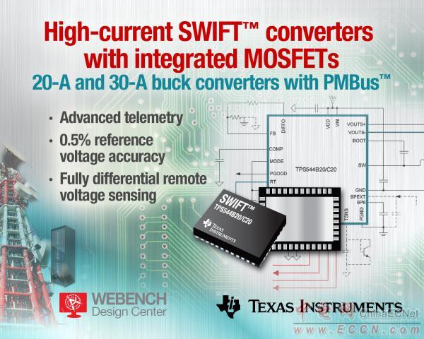TI宣布推出業(yè)界首批具有 PMBus 接口的 18V、20A 及 30A 同步 DC/DC 降壓轉(zhuǎn)換器。該 SWIFT TPS544B20 及 TPS544C20 轉(zhuǎn)換器采用小型 QFN 封裝并支持集成型 MOSFET,可在空間有限的高功率密度應(yīng)用中驅(qū)動(dòng)ASIC,能夠充分滿足有線及無線通信、企業(yè)與云計(jì)算以及數(shù)據(jù)存儲(chǔ)系統(tǒng)等不同市場(chǎng)的需求。這些轉(zhuǎn)換器與 TI 屢獲殊榮的 WEBENCH® 在線設(shè)計(jì)工具配合使用,可簡(jiǎn)化電源轉(zhuǎn)換,加速電源設(shè)計(jì)進(jìn)程。