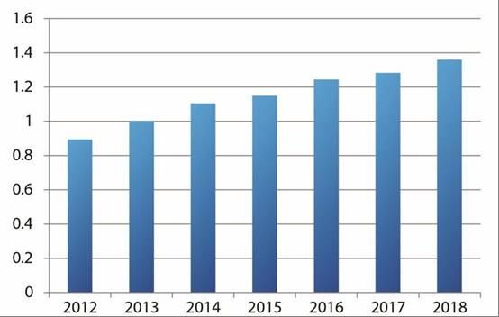 F1:車載電子元器件的電源IC銷售額示意圖(以2013年為“1”計(jì)算)