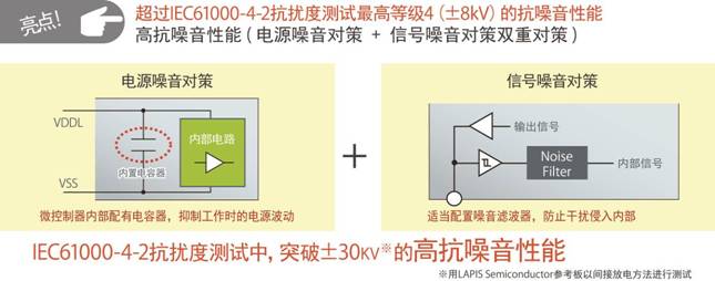 沿用8bit MCU ML610100系列的電路方式,在國際電工委員會(IEC)頒布的標(biāo)準(zhǔn)IEC61000-4-2的測試中,突破間接放電最高等級4(±8kV),成功達到測量極限±30kV。