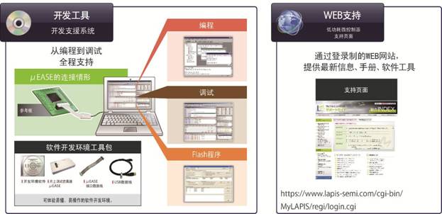 本LSI還具備完善的支持體制,備有可輕松開始評估的“ML620150家族”參考板和軟件開發(fā)環(huán)境。不僅如此,還設(shè)有 "用戶支持頁面" ,登錄LAPIS Semiconductor官方網(wǎng)站即可利用各種手冊和工具等。