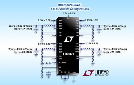 Linear推出高度集成的通用型電源管理解決方案 LTC3371,以用于需要多個低壓電源的系統(tǒng)。該器件具有四個同步降壓型轉換器,各由獨立的 2.25V 至 5.5V 輸入供電,而且均可通過配置以共享 8 個可用 1A 功率級中的最多 4 個。利用 8 種獨特的輸出電流配置,LTC3371提供了實質(zhì)的靈活性以及容易重復使用于不同應用中。該器件是多種多通道工業(yè)、汽車、通信和分布式電源系統(tǒng)的理想選擇。
