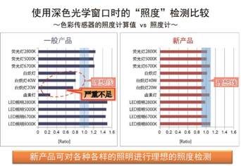 實(shí)現(xiàn)業(yè)界最高的紅外線過濾特性,將紅外線的影響降到以往產(chǎn)品的1/10以下,從而可有效提取出可視光。使用設(shè)計(jì) 自由度更高的深色光學(xué)窗口也可檢測(cè)可視光,從而可在不同照明情況下,更準(zhǔn)確地計(jì)算出照度和色溫。