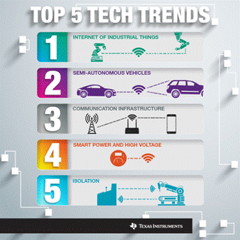 在迎接2015到來之際,我們有必要花時間來評估和預測未來的一年中將會出現(xiàn)的技術挑戰(zhàn)和突破創(chuàng)新。通過與眾多戰(zhàn)略客戶、大學合作伙伴以及TI產(chǎn)品線的技術專家進行探討后,我們認為TI將在一些重要技術趨勢中發(fā)揮戰(zhàn)略性作用。這些技術趨勢正推動著汽車和工業(yè)等多個市場的發(fā)展,而在此過程中,TI的工程師將幫助應對半導體技術領域的獨特挑戰(zhàn),并利用先進技術改善我們的生活。