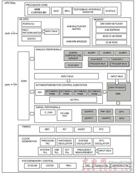 NXP公司的LPC15xx系列是基于ARM Cortex-M3核的微控制器(MCU),具有豐富外設(shè)和非常低的功耗,CPU頻率高達72MHz,采用3級流水線和哈佛架構(gòu),多達256KB片上編程的閃存,36KB SRAM和4KB EEPROM,主要用在馬達控制,太陽能逆變器,馬達驅(qū)動器,家用電器,建筑物和工廠自動化,工業(yè)和藹醫(yī)療以及數(shù)字電源.本文介紹了LPC15xx系列主要特性和優(yōu)勢,框圖,以及LPC1549馬達控制板主要特性,框圖和電路圖.