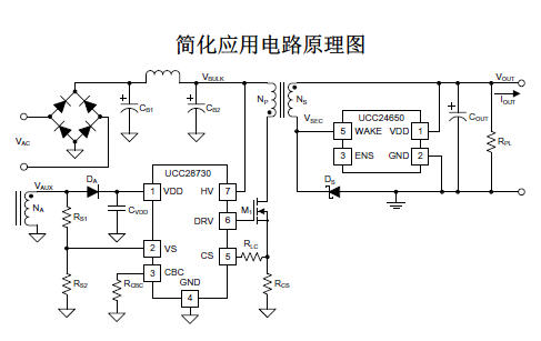現有初級側穩(wěn)壓電源的主要設計局限在于如何在保持低待機功率的情況下,仍保證較高的瞬變響應性能。UCC28730和UCC24650芯片集在盡可能提供最佳瞬變響應性能的同時,實現了零待機功耗。其中UCC24650不僅免除對光耦合器件和TL431等回饋組件的需要,從而降低了成本,而且其內置喚醒控制器中的TI電壓偏低檢測功能還在保持窄輸出電壓穩(wěn)壓窗口(支持零到滿負載瞬變)的情況下,還可以應用微型輸出電容器。