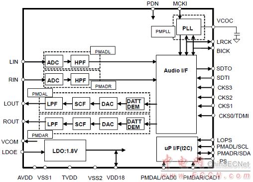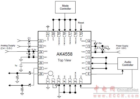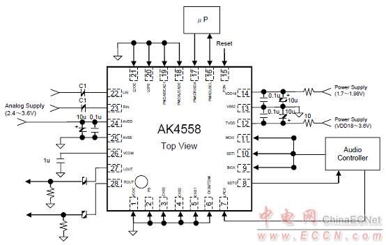 圖3. AK4558系統(tǒng)連接框圖(PS pin= “L”, LDOE pin= “L”)