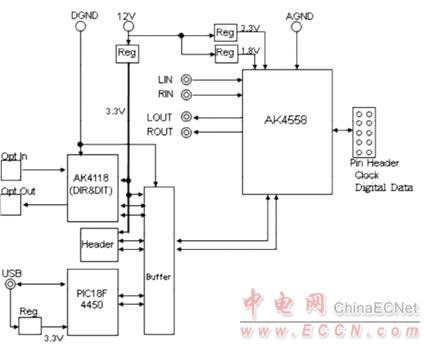 圖5.評(píng)估板AKD4558-A板框圖