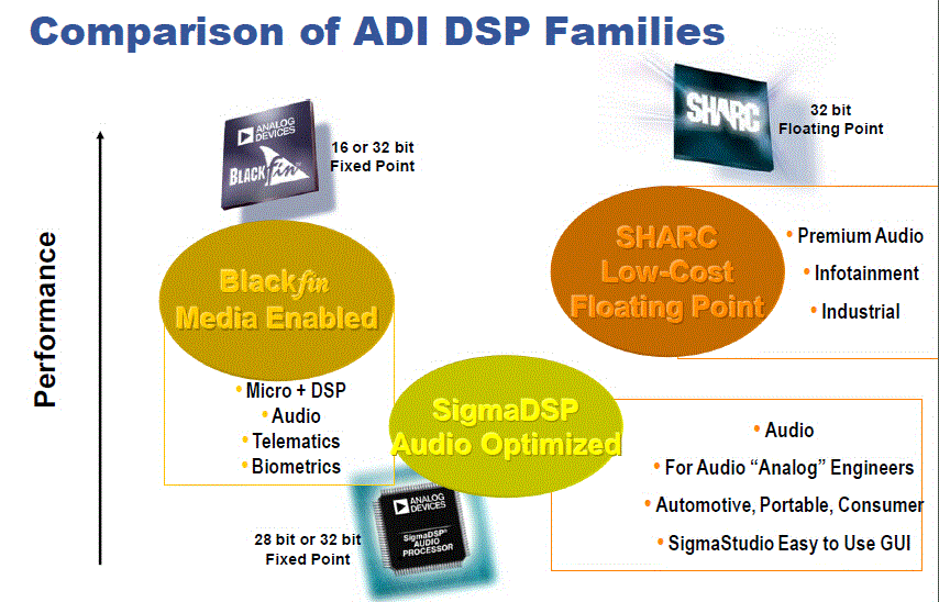 實(shí)際上,ADI針對(duì)音頻市場(chǎng)的不同要求,有著清晰的產(chǎn)品劃分。用在高端的是SHARC® DSP,用在中高端的是Blackfin® DSP家族,用在主流產(chǎn)品的是ADAU145x系列,入門級(jí)則由ADAU17xx擔(dān)當(dāng)。