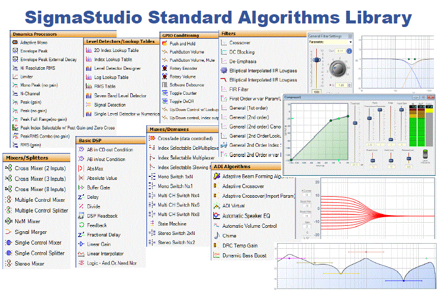 這里必須要提到SigmaStudioTM,這是一款功能很大的圖形化編程工具。它擁有龐大的資源,用戶可以在里面選擇想要的動(dòng)態(tài)處理器、混頻器、DSP、濾波器,直接拖放,就能完成設(shè)計(jì)。
