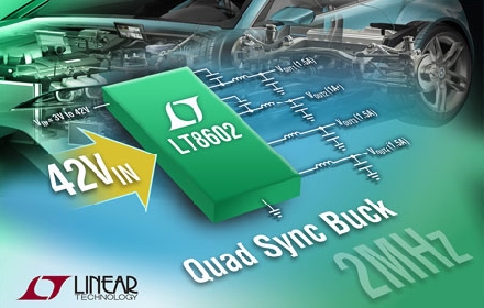 Linear推出可達(dá) 42V 輸入、高效率、四輸出同步單片降壓型開關(guān)穩(wěn)壓器 LT8602。該器件的 4 通道設(shè)計整合了高壓 2.5A 和 1.5A 兩個通道以及兩個較低電壓的 1.8A 通道,以提供 4 路獨(dú)立輸出,從而可提供低至 0.8V 的電壓。其同步整流拓?fù)涮峁└哌_(dá) 93% 的效率,同時突發(fā)模式 (Burst Mode®) 工作在無負(fù)載備用情況下保持靜態(tài)電流低于 30µA (所有通道),從而使該器件非常適合始終保持接通的系統(tǒng)。就噪聲敏感型應(yīng)用而言,LT8602 運(yùn)用其脈沖跳躍模式工作以最大限度降低開關(guān)噪聲,并滿足 CISPR25 Class 5 EMI 要求。開關(guān)頻率可設(shè)定在 250kHz 至 2.2MHz 范圍,并可在這個范圍內(nèi)同步。