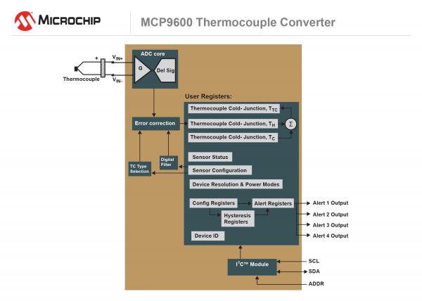 熱電偶廣泛應用于工業(yè)、消費類、汽車/航空和石油化工等領域的溫度測量。MCP9600為設計人員提供了世界首個即插即用解決方案,以便打造基于熱電偶的設計,因為有了MCP9600,就根本無需具備實現(xiàn)分立元件所需的專業(yè)知識,例如使用單片機的數(shù)學引擎開發(fā)固件。設計人員不再需要創(chuàng)造精密儀表電路來準確測量熱電偶的微伏級信號,也不需要設計ADC電路來準確計算溫度。通過MCP9600的集成冷端補償,無需專業(yè)的熱設計也可通過計算熱電偶的“熱”端溫度來精確測量熱電偶“冷”端的參考溫度。