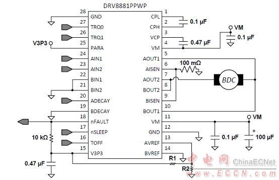 圖5。DRV8881P驅(qū)動有刷DC馬達應(yīng)用框圖