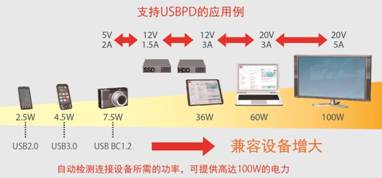 利用USB連接線,可進(jìn)行高達(dá)100W供受電的USB功率擴(kuò)展標(biāo)準(zhǔn)?山o筆記本電腦等以往無(wú)法通過(guò)USB供電進(jìn)行驅(qū)動(dòng)的設(shè)備供電,可實(shí)現(xiàn)移動(dòng)設(shè)備的快速充電(縮短充電時(shí)間)。