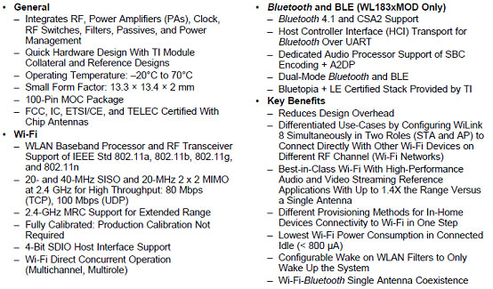• Reduces Design Overhead: Single WiLink8™ Module Scales Across Wi-Fi and Bluetooth.
