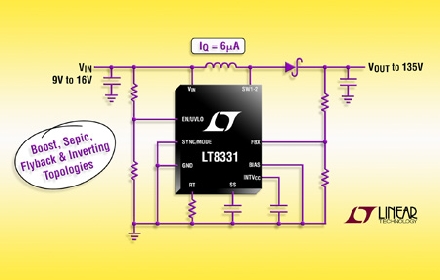 LT8331 的內(nèi)部高效率 0.5A 開關(guān)提供高達 90% 的效率。單個反饋電阻器設(shè)定輸出電壓,而無論輸出為正或為負,從而最大限度減小了外部組件尺寸。LT8331 的 SYNC/MODE 引腳允許同步至一個外部時鐘,或者該引腳也可用來選擇突發(fā)模式工作以實現(xiàn)超低 IQ,或選擇脈沖跳躍模式以實現(xiàn)盡可能最低的噪聲。其他特點包括可編程欠壓閉鎖 (UVLO)、內(nèi)部軟啟動、頻率折返和過熱停機保護。