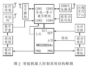控制系統(tǒng)以DSP(TMS320C54x)為核心部件,由藍(lán)牙無(wú)線(xiàn)通信、GSM無(wú)線(xiàn)通信(支持GPRS)、電機(jī)驅(qū)動(dòng)、數(shù)字羅盤(pán)、感覺(jué)功能傳感器(視覺(jué)和聽(tīng)覺(jué)等)、醫(yī)療傳感器和多選一串口通信(RS-232)模塊等組成,控制系統(tǒng)框圖如圖2所示。