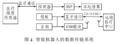 在智能機(jī)器人上安裝1個(gè)帶有藍(lán)牙模塊的探測(cè)器作為接收設(shè)備,各種醫(yī)療傳感器將采集到的生理信息數(shù)據(jù)通過(guò)藍(lán)牙模塊傳輸?shù)教綔y(cè)器,探測(cè)器有2種工作方式:一是將數(shù)據(jù)交給智能機(jī)器人處理,提供本地結(jié)果;二是與Internet連接(也可以通過(guò)GSM無(wú)線(xiàn)模塊直接發(fā)回),通過(guò)網(wǎng)絡(luò)將數(shù)據(jù)傳輸?shù)竭h(yuǎn)程醫(yī)療中心,達(dá)到醫(yī)療保健與遠(yuǎn)程監(jiān)護(hù)的目的。視頻和音頻數(shù)據(jù)的傳輸也采用這種方式。智能機(jī)器人的數(shù)據(jù)傳輸系統(tǒng)如圖4所示。
