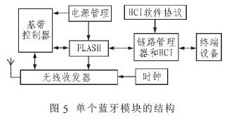 ROK101007型藍(lán)牙模塊是愛(ài)立信公司推出的適合于短距離通信的無(wú)線(xiàn)基帶模塊。它的集成度高、功耗小(射頻功率為1mW),支持所有的藍(lán)牙協(xié)議,可嵌入任何需要藍(lán)牙功能的設(shè)備中。該模塊包括基帶控制器、無(wú)線(xiàn)收發(fā)器、閃存、電源管理模塊和時(shí)鐘5個(gè)功能模塊,可提供高至HCI(主機(jī)控制接口)層的功能。單個(gè)藍(lán)牙模塊的結(jié)構(gòu)如圖5所示。