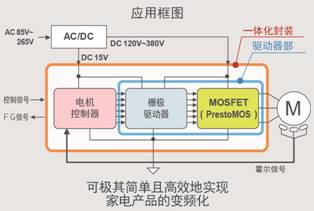 采用一體化封裝,將利用模擬設(shè)計技術(shù)優(yōu)勢開發(fā)的已取得豐碩業(yè)績的電機(jī)控制器,內(nèi)置于搭載了ROHM獨創(chuàng)的600V耐壓PrestoMOS的驅(qū)動器。因此,可極其簡單地實現(xiàn)以往只能用2個封裝實現(xiàn)的高效正弦波電機(jī)等。與搭載普通MOSFET的風(fēng)扇電機(jī)驅(qū)動器(500V耐壓)相比,可最大限度地發(fā)揮PrestoMOS的特性,并成功實現(xiàn)更高耐壓與更低損耗,在電力基礎(chǔ)設(shè)施不穩(wěn)定的國家和地區(qū)也可放心使用。