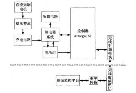 無人機電源管理系統(tǒng)是飛機實現(xiàn)自主飛行的重要組成部分, 其大致框架如圖1 所示。在該系統(tǒng)中, 利用AXI 公司生產(chǎn)的2212/ 34 型號發(fā)電機將動能轉換為220V 交流電, 再經(jīng)過整流穩(wěn)壓后輸出11.6V 的直流電壓, 可由該輸出電壓為兩節(jié)鋰電池充電。電源管理系統(tǒng)的控制器是meg a161單片機, 該控制器通過檢測兩節(jié)鋰電池的電壓大小從而控制繼電器開關來對電池進行充放電管理。