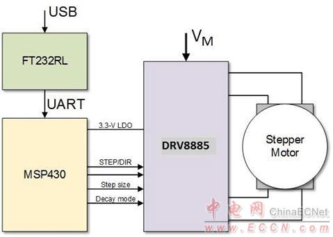 The EVM houses an MSP430 microcontroller and an USB interface chip. The USB chip allows for serialcommunications from a PC computer where a Windows® application is used to schedule serialcommands. These commands can be used to control each of the device’s signals, and drive the steppermotor by issuing the step commands at the desired rate.
