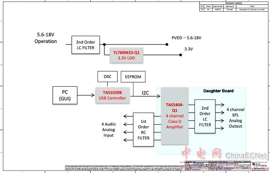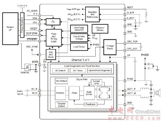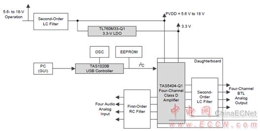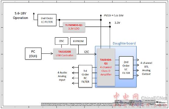 圖4.汽車四路D類放大器參考設(shè)計(jì)TIDA-00573框圖