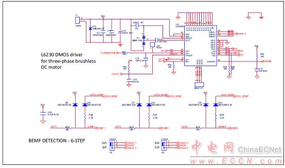 圖9.馬達控制平臺P-NUCLEO-IHM001電路圖:L6230驅(qū)動器和BEMF檢測電路
