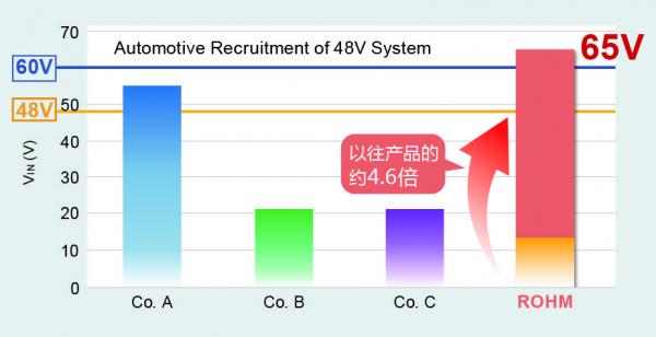 通過采用ROHM產(chǎn)的高耐壓MOSFET,成功將輸入電壓范圍擴(kuò)大到12〜65V,達(dá)以往產(chǎn)品的約4.6倍。因此,可支持從車載到工業(yè)設(shè)備的廣泛應(yīng)用領(lǐng)域。