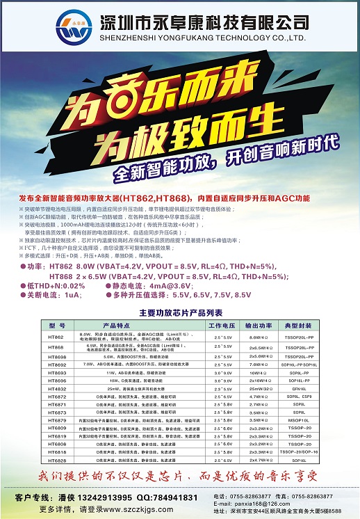 | ·I2S數(shù)字功放IC/內(nèi)置DSP音頻算法功放芯片 ·馬達(dá)驅(qū)動IC ·2.1聲道單芯片D類功放IC ·內(nèi)置DC/DC升壓模塊的D類功放IC ·鋰電充電管理IC/快充IC ·無線遙控方案 ·直流無刷電機(jī)驅(qū)動芯片 |