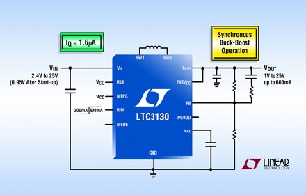 Linear推出同步電流模式降壓-升壓型轉(zhuǎn)換器 LTC3130 和 LTC3130-1,這些器件可從多種輸入源提供高達(dá) 600mA 連續(xù)輸出電流,輸入源包括單節(jié)或多節(jié)電池以及太陽(yáng)能電池板和超級(jí)電容器。其 2.4V 至 25V 輸入電壓范圍和 1V 至 25V 輸出范圍 (LTC3130 是可調(diào)的) 在輸入高于、低于或等于輸出時(shí),可提供穩(wěn)定輸出。用戶可選突發(fā)模式 (Burst Mode®) 工作使靜態(tài)電流降至僅為 1.6µA (無(wú)負(fù)載時(shí)為 1.2µA),從而提高了輕負(fù)載時(shí)的效率,并延長(zhǎng)了電池運(yùn)行時(shí)間。LTC3130/-1 采用的專有降壓-升壓型拓?fù)湓谒泄ぷ髂J较露伎商峁┑驮肼暋o(wú)抖動(dòng)切換,非常適合那些對(duì)電源噪聲敏感的 RF 及精確模擬應(yīng)用。該器件還包括可編程最大功率點(diǎn)控制 (MPPC) 功能,從而確保從光伏電池等非理想型電源提供最大功率。LTC3130-1 具備 LTC3130 所提供的全部功能,還可提供 4 個(gè)用戶可選固定輸出電壓,分別為 1.8V、3.3V、5V 和 12V,從而無(wú)需可調(diào)輸出版本所需的電阻分壓器。