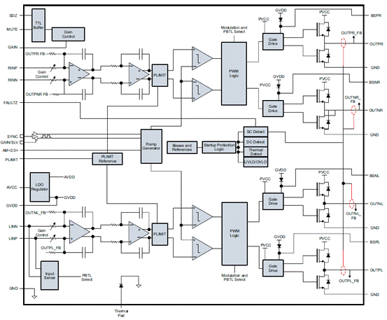 The TPA31xxD2 advanced oscillator/PLL circuit employs a multiple switching frequency option to avoid AM interferences; this is achieved together with an option of Master/Slave option, making it possible to synchronize multiple devices.
