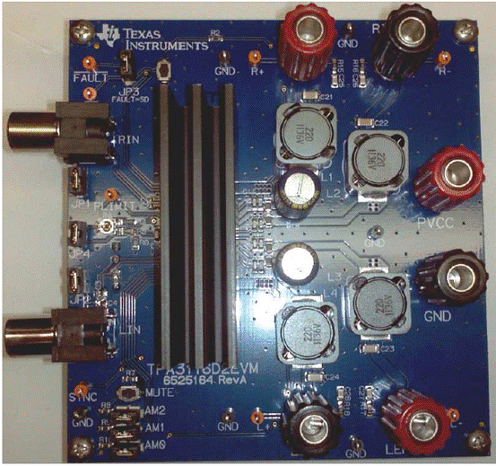 The TPA3116D2EVM evaluation module (EVM) demonstrates the integrated circuits TPA3116D2 from Texas Instruments (TI).