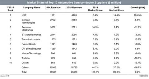 針對這一市場,合并后的新公司將成為重量級的車用芯片巨擘。而這起收購對于競爭對手又將帶來多大的沖擊?現(xiàn)在還不得而知,不過,無疑地,目前在車用市場別排名第四、第五的意法半導體(STMicroelectronics)和德州儀器(Texas Instruments)應該會有所顧慮。