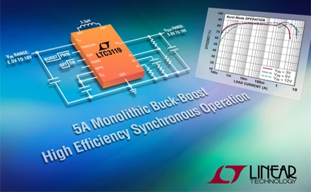 Linear推出同步電流模式單片降壓-升壓型轉換器 LTC3119,該器件在降壓模式提供高達 5A 連續(xù)輸出電流,可以使用多種輸入電源,包括單節(jié)或多節(jié)電池、未調節(jié)的交流適配器以及太陽能電池板和超級電容器。一旦啟動,該器件的 2.5V 至 18V 輸入電壓范圍可擴展到低至 250mV。輸出電壓在輸入高于、低于或等于輸出時可穩(wěn)定,并可設定在 0.8V 至 18V 范圍。用戶可選的突發(fā)模式 (Burst Mode®) 運作將靜態(tài)電流降至僅為 35µA,從而提高了輕負載時的效率,同時延長了電池運行時間。LTC3119 采用專有的 4 開關 PWM 降壓-升壓型拓撲,在所有工作模式下可提供低噪聲和無抖動切換,因此非常適合對電源噪聲敏感的 RF 和高精確度模擬應用。該器件還包括可編程的最大功率點控制 (MPPC) 功能,從而在使用具高輸出阻抗或光伏電池時,可確保從電源提供最大功率。