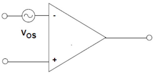 理想狀態(tài)下,如果運(yùn)算放大器的兩個(gè)輸入端電壓完全相同,輸出應(yīng)為0 V。實(shí)際上,還必須在輸入端施加小差分電壓,強(qiáng)制輸出達(dá)到0。該電壓稱為輸入失調(diào)電壓Vos。輸入失調(diào)電壓可以看成是電壓源Vos,與運(yùn)算放大器的反相輸入端串聯(lián),如圖所示。